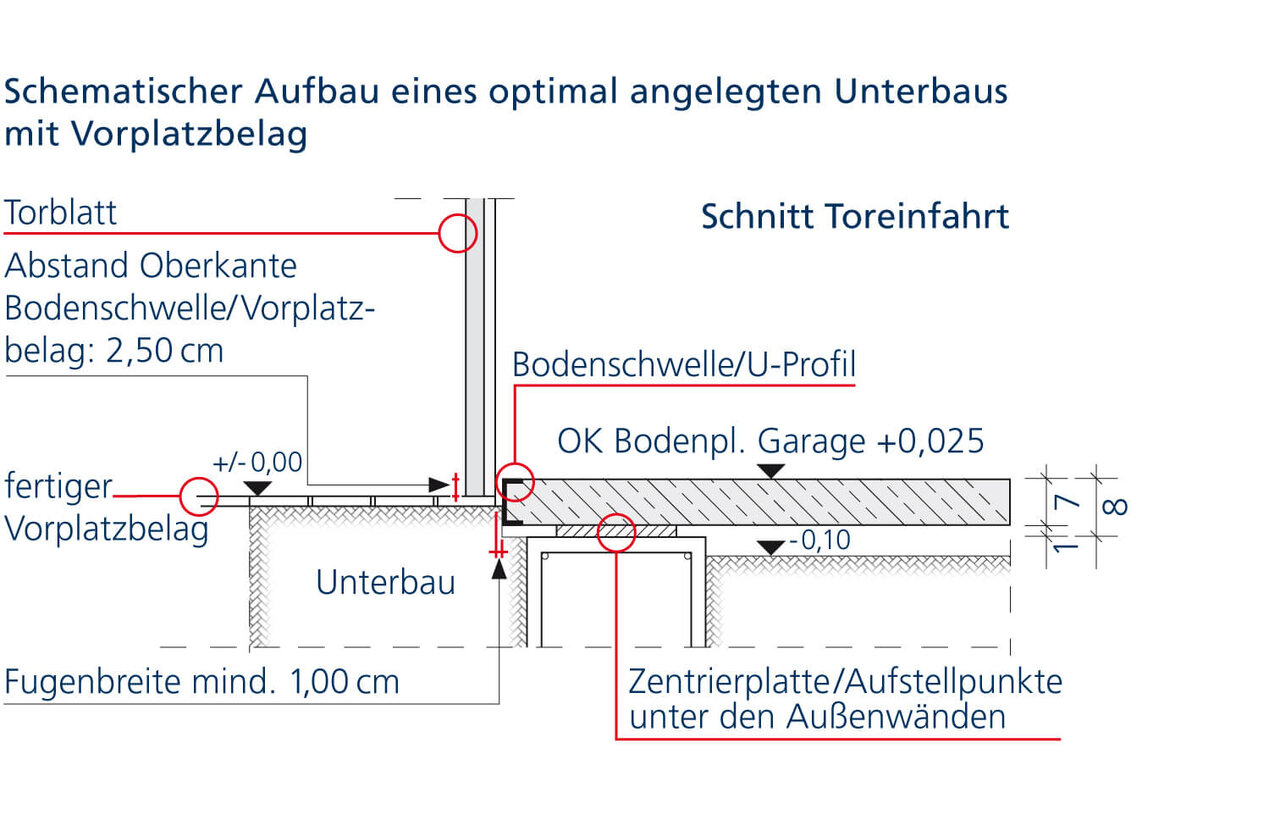 Eine Betonfertiggarage ist ein eigenständiges Bauwerk. Vermeiden Sie Verspannungen durch angrenzende Bauteile, im Erdreich oder durch Beläge. Bedenken Sie die tägliche Belastung Ihrer Garagenzufahrt durch Fahrzeugbewegungen aber auch durch Witterungseinflüsse. Wichtig: Stellen Sie bei Ihrer Planung sicher, dass sich zwischen der Oberfläche des Vorplatzbelags und der Unterkante Ihres Garagentores ein Abstand von mindestens 2,5cm befindet. Achten Sie bitte bei der Gesamtplanung ebenfalls darauf, dass Ihre Garagenzufahrt ein leichtes Gefälle weg vom Garagentor hin zur Straße aufweist, um Wasseransammlungen vor oder in der Garage zu vermeiden.